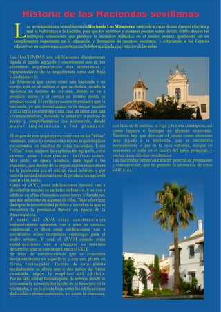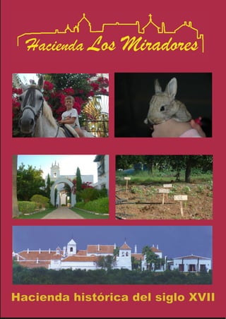 Este documento describe las instalaciones y actividades educativas de una hacienda histórica del siglo XVII. La hacienda cuenta con grandes salones, caballerizas, zonas para diferentes animales de granja, un huerto, jardín y campo para realizar actividades al aire libre relacionadas con la naturaleza, agricultura y ganadería. Los estudiantes pueden aprender sobre el cuidado de animales, reconocer distintas razas de gallinas, caballos y aves, y participar en actividades como cocina, cetrería y tiro con