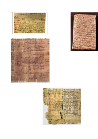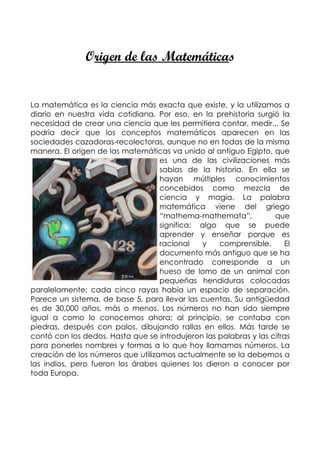 El documento resume brevemente el origen y desarrollo de las matemáticas en varias civilizaciones antiguas como Egipto, Mesopotamia, países árabes y China. En Egipto surgió uno de los primeros sistemas de numeración alrededor del 2700 a.C. y desarrollaron métodos para realizar operaciones matemáticas básicas. En Mesopotamia las matemáticas se usaban para resolver problemas económicos y la construcción. Los árabes tradujeron textos griegos y desarrollaron conceptos como
