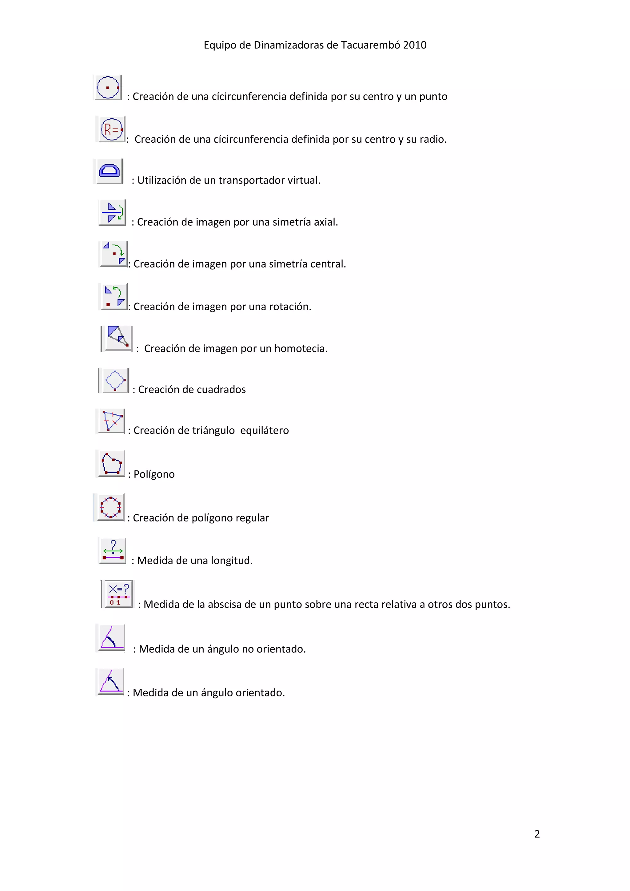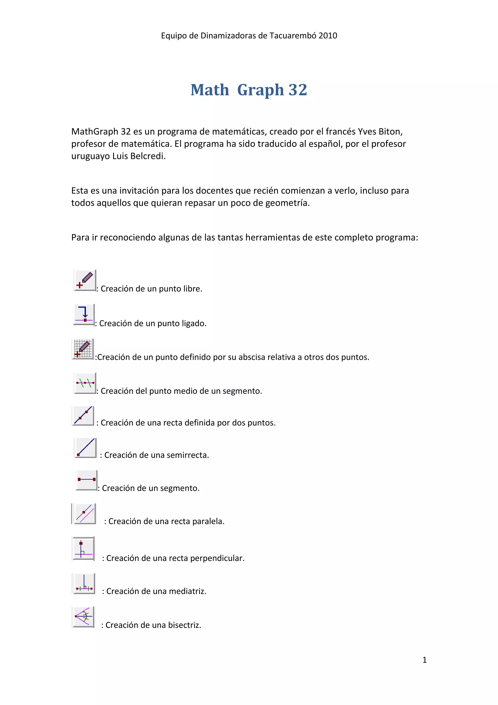Este documento presenta el programa de matemáticas MathGraph 32, creado por Yves Biton y traducido al español por Luis Belcredi. Explica las herramientas del programa para crear puntos, líneas, segmentos, circunferencias y polígonos. También incluye ejemplos prácticos para construir figuras geométricas y medir ángulos con el programa.