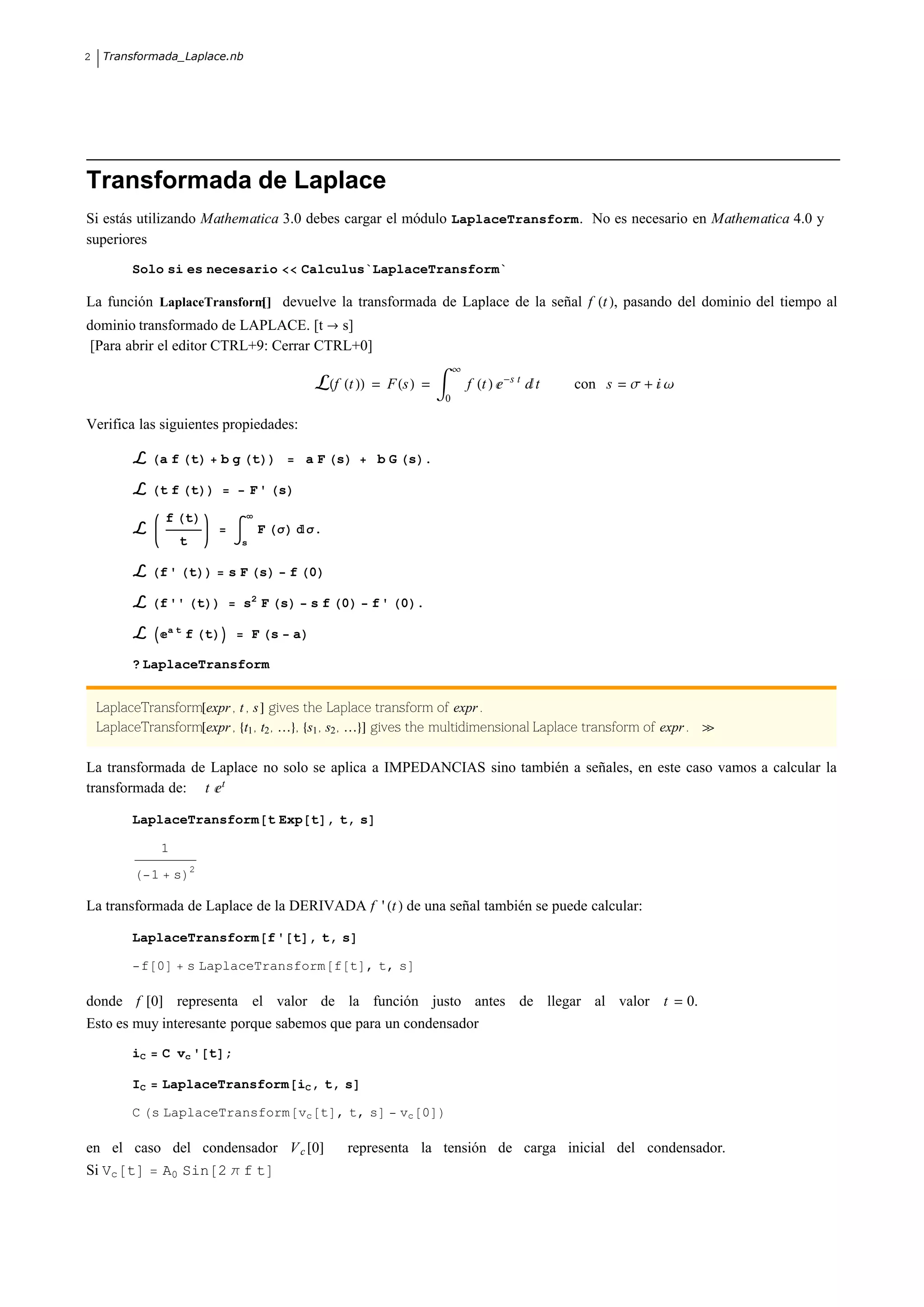Este documento describe la transformada de Laplace y su uso para calcular la función de transferencia de circuitos electrónicos. Explica cómo usar la transformada de Laplace directamente para pasar del dominio del tiempo al dominio de Laplace, y la transformada inversa de Laplace para hacer lo contrario. También proporciona ejemplos como calcular las transformadas de funciones como seno, coseno, exponenciales y la función escalón de Heaviside.