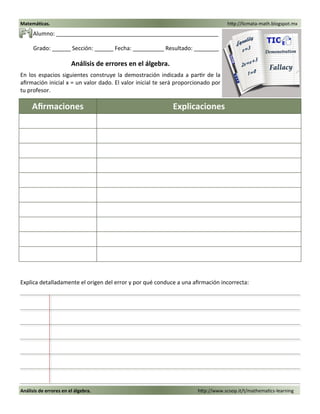 El documento trata sobre el análisis de errores en álgebra, proporcionando una estructura para que los alumnos demuestren y analicen errores a partir de afirmaciones iniciales. Se insta a los estudiantes a explicar detalladamente el origen del error y las implicaciones de una afirmación incorrecta. Se incluye un formato para que los alumnos registren su análisis con campos específicos.