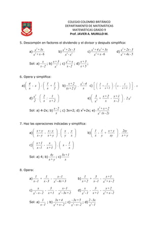 Este documento contiene ejercicios de álgebra que involucran simplificación de fracciones algebraicas. Los ejercicios incluyen simplificar fracciones, factorizar expresiones algebraicas, operar con fracciones algebraicas y resolver ecuaciones algebraicas elementales.