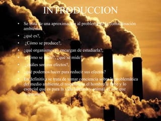 Este documento define la contaminación ambiental y describe sus principales causas y efectos. Explica que la contaminación ocurre cuando sustancias dañinas se acumulan en el medio ambiente en niveles que perjudican ecosistemas y seres vivos. Detalla que los principales contaminantes son de origen humano como combustibles fósiles, desechos industriales y basura. Estos contaminantes afectan negativamente la salud humana y contribuyen a problemas como el cambio climático. Finalmente, enfatiza la necesidad de reducir la contaminación para proteger