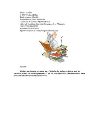 El documento presenta un resumen de la novela Matilda de Roald Dahl. Cuenta la historia de una niña brillante de 4 años llamada Matilda que desarrolla un gran amor por la lectura. Sus padres no valoran su inteligencia y la dejan sola todas las tardes mientras van al bingo. Matilda descubre la biblioteca pública y lee muchos libros famosos para adultos, impresionando a la bibliotecaria con su capacidad.