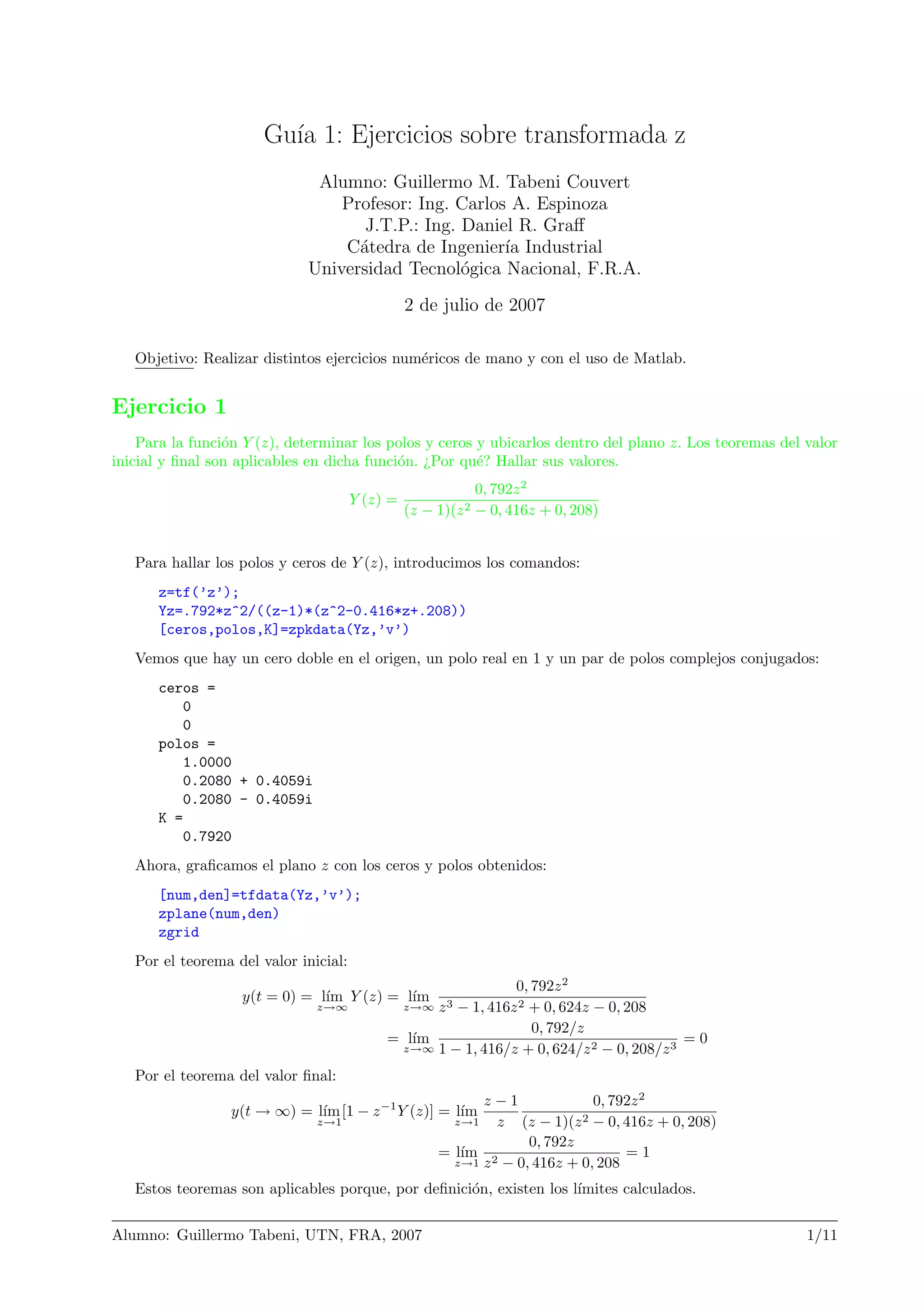 Este documento presenta 6 ejercicios sobre transformada z. Cada ejercicio analiza una función o ecuación diferencial determinando su transformada z de manera analítica y numérica usando Matlab. Los ejercicios incluyen hallar polos y ceros, obtener la función discreta, resolver ecuaciones recursivas, y encontrar expresiones en forma cerrada. Los resultados se comparan gráficamente.