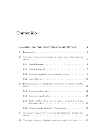 Este documento presenta un tutorial sobre el análisis y control de sistemas usando MATLAB. Explica cómo analizar sistemas continuos y discretos tanto en el dominio temporal como frecuencial mediante funciones de transferencia y representaciones en el espacio de estados. También muestra cómo manipular funciones de transferencia como objetos y resume los comandos más importantes de la Control System Toolbox de MATLAB.