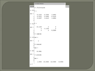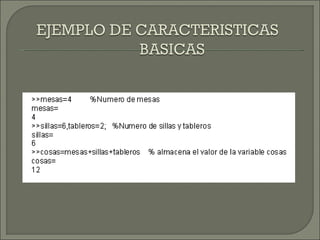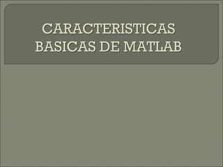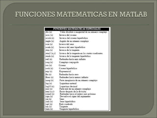 Este documento describe las funcionalidades y usos de MATLAB. MATLAB es una herramienta de cómputo numérico que permite realizar cálculos matemáticos y crear programas personalizados. Ofrece funciones para álgebra lineal, cálculo matricial, gráficos, procesamiento de datos y desarrollo de aplicaciones a través de toolboxes. El usuario puede ejecutar comandos de MATLAB en la línea de comandos o en archivos M para automatizar tareas.