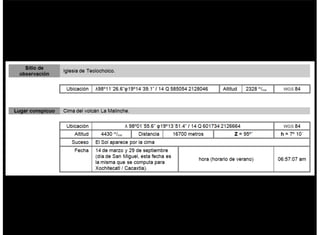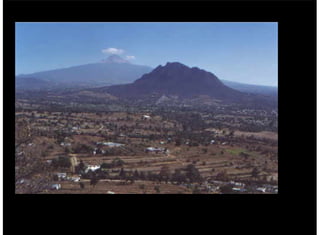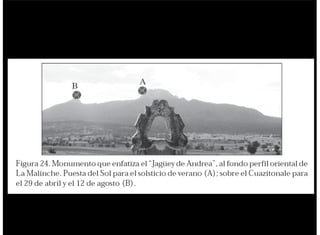 El documento describe la arqueología encontrada en el volcán La Malinche, incluyendo sitios arqueológicos, artefactos y estructuras encontradas a diferentes altitudes que datan principalmente del Posclásico. También describe rituales y ofrendas realizadas en La Malinche como parte de la religión prehispánica.