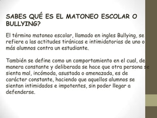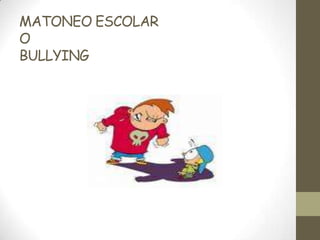 El documento habla sobre el bullying o matoneo escolar. Define el término como actitudes tiránicas e intimidatorias de uno o más estudiantes contra otro de manera constante, haciéndolo sentir mal, asustado o amenazado. Da ejemplos de manifestaciones como exigir dinero, golpes, burlas e insultos. Explica que puede tener consecuencias como daño psicológico a largo plazo tanto en la víctima como en el agresor. Finalmente, recomienda estrategias para prevenirlo o corregirlo como la