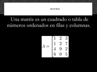 Una matriz es una tabla de números ordenados en filas y columnes. El documento explica cómo calcular el determinante de una matriz usando la fórmula =MDTERM() en Excel y cómo sumar dos matrices de la misma dimensión mediante la suma de los elementos en las mismas posiciones.