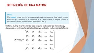 Este documento trata sobre matrices y determinantes. Explica qué es una matriz, sus elementos y dimensiones. Presenta ejemplos de matrices como la compra de bocadillos. Describe operaciones con matrices como suma, resta, multiplicación por un escalar y producto. Finalmente, define determinantes de orden 2 y 3, y explica la regla de Sarrus para calcularlos.