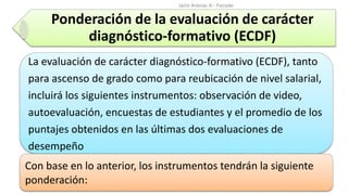 Este documento describe la evaluación de carácter diagnóstico-formativo (ECDF) para docentes. Establece los instrumentos de evaluación y su ponderación, incluyendo observación de video, autoevaluación, encuestas de estudiantes y promedio de las últimas dos evaluaciones de desempeño. Asigna pesos entre el 80-10% a cada instrumento. Explica también los criterios y componentes que serán evaluados, como contexto de la práctica docente, reflexión y planeación, praxis pedagógica y ambiente de aula.