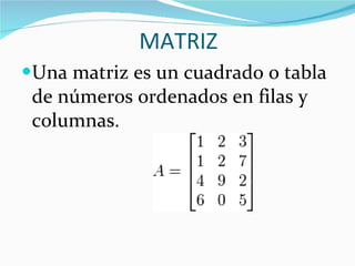 El documento explica conceptos básicos sobre matrices, incluyendo que una matriz es una tabla de números ordenados en filas y columnas, cómo calcular el determinante de una matriz usando la fórmula MDTERM, y cómo sumar dos matrices de igual tamaño mediante la suma de los elementos en las mismas posiciones.