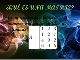 Una matriz es un cuadrado o tabla de números ordenados en filas y columnas. Para sumar o restar matrices, deben tener el mismo tamaño, sumando o restando los elementos en la misma posición. Para multiplicar matrices, el número de columnas de la primera debe ser igual al número de filas de la segunda, y la fórmula es MMULT(primer rango:segundo rango).