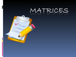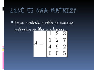 Una matriz es un cuadrado o tabla de números ordenados en filas y columnes. Para sumar o restar matrices, deben tener el mismo tamaño, sumando o restando los elementos en la misma posición. Para multiplicar matrices, el número de columnas de la primera debe ser igual al número de filas de la segunda.