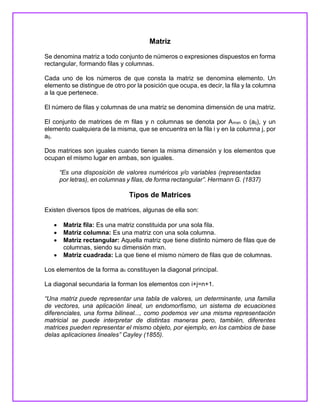 El documento describe las matrices, incluyendo su definición, tipos y aplicaciones. Las matrices son conjuntos de números dispuestos en filas y columnas que se usan para almacenar y organizar datos relacionados. Se utilizan comúnmente para resolver sistemas de ecuaciones lineales en diversas áreas como ingeniería, economía, ciencia e incluso en la vida cotidiana.