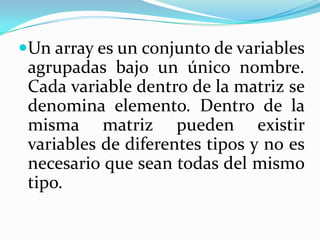 Un array es un conjunto de variables agrupadas bajo un nombre único, donde cada variable se denomina elemento y pueden ser de diferentes tipos. Existen arrays indexados donde el acceso es por posición y arrays asociativos donde el acceso es por clave-valor. En PHP se pueden crear arrays de forma implícita indicando el elemento o posición o mediante la función array().