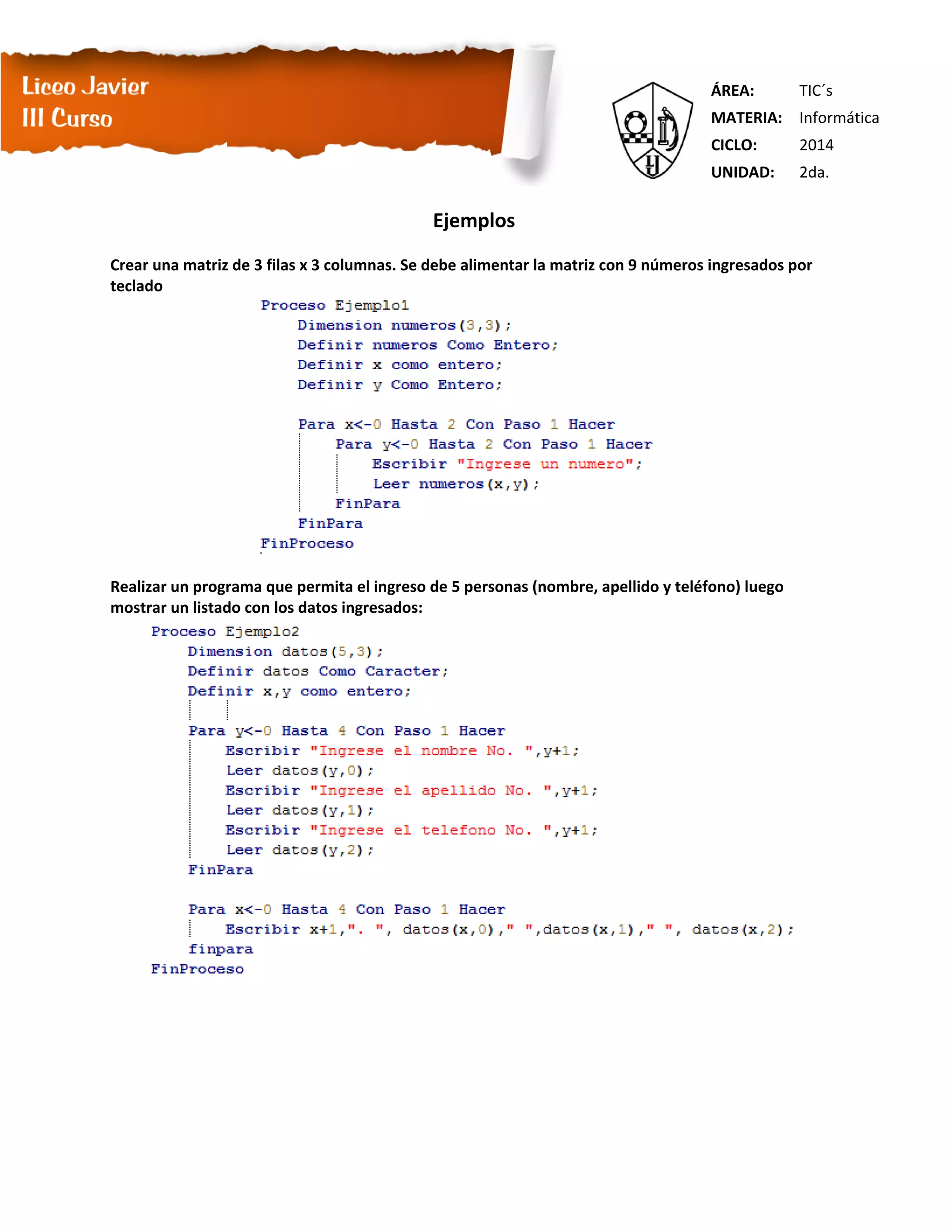 Una matriz es un arreglo bidimensional que está compuesto por filas y columnas. Cada elemento de la matriz se identifica por su coordenada fila, columna. Para declarar una matriz se debe especificar el nombre, número de filas y columnas. Los ejemplos muestran cómo crear una matriz vacía y llenarla con datos ingresados por el usuario, así como mostrar datos de personas en una matriz.