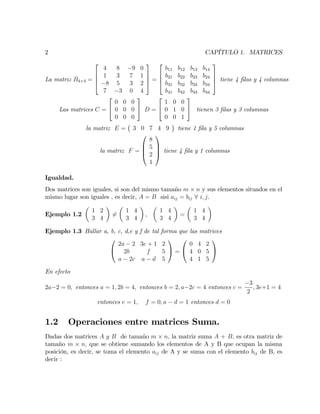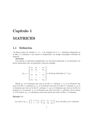 Este documento define matrices y describe sus operaciones básicas. Una matriz se define como un conjunto de elementos dispuestos en filas y columnas. Se explican la suma, resta y multiplicación de matrices, incluidas propiedades como la conmutatividad y asociatividad. La multiplicación de matrices solo es posible si el número de columnas de la primera matriz es igual al número de filas de la segunda.