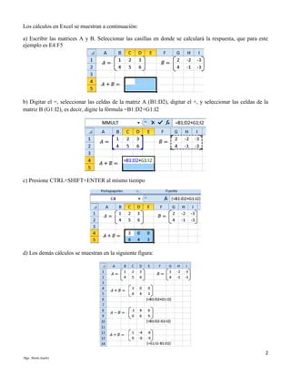 Este documento explica conceptos básicos sobre matrices y determinantes, incluyendo definiciones, operaciones como suma, resta, multiplicación por un escalar y entre matrices, así como propiedades de determinantes. También muestra cómo realizar estos cálculos utilizando Excel a través de fórmulas matemáticas.