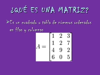 ¿QUÉ ES UNAMATRIZ? Es un cuadrado o tabla de números ordenados en filas y columnas