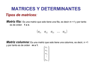 Este documento define las matrices y sus tipos, y describe operaciones básicas con ellas como suma, multiplicación por escalares, producto de matrices, y cálculo de la inversa de una matriz mediante los métodos de Gauss-Jordan y determinantes. Explica que una matriz es una tabla rectangular de elementos ordenados en filas y columnas, y define matrices cuadradas, triangulares, nulas, escalares e identidad.