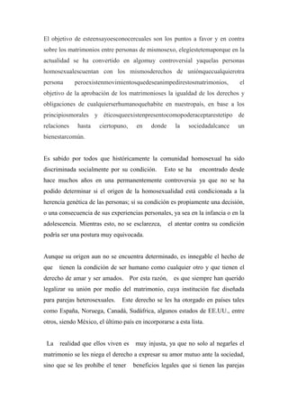 El documento discute los puntos a favor y en contra de los matrimonios entre personas del mismo sexo. A favor señala que la comunidad homosexual ha sido históricamente discriminada y que merecen los mismos derechos legales que las parejas heterosexuales, como expresar su amor ante la sociedad. En contra, algunos argumentan que va en contra de sus principios morales. El objetivo final es lograr la igualdad de derechos para todos los seres humanos.