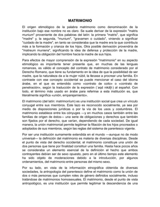 El documento presenta una introducción al tema del matrimonio. Luego define el matrimonio, discute sus características como la dualidad y heterosexualidad, y describe diferentes tipos de matrimonio como el matrimonio civil, religioso y católico. Finalmente, explica brevemente otros tipos como el matrimonio por levirato y de conveniencia.