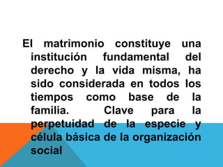 El documento aborda el matrimonio como una institución esencial del derecho y la sociabilidad, definiéndolo como la unión voluntaria y duradera entre un hombre y una mujer, fundamentada en deberes y derechos mutuos, incluidos la fidelidad y el sustento familiar. A través del Código Civil se establecen los requisitos legales para contraer matrimonio, así como las implicaciones patrimoniales y económicas derivadas de esta unión, como la creación de la sociedad de gananciales. Además, se detallan los procedimientos de publicación y la importancia del matrimonio en la formación de la familia y en la organización social.