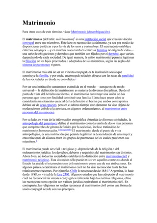 El matrimonio es una institución social que crea un vínculo conyugal entre dos personas y establece derechos y obligaciones entre la pareja y sus familias. Desde el punto de vista antropológico, el matrimonio legitima la descendencia y crea alianzas entre grupos familiares, mientras que desde el derecho occidental constituye una unión para formar una familia. El matrimonio puede ser civil o religioso y sus requisitos dependen de cada religión o sistema legal.