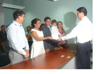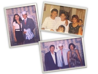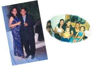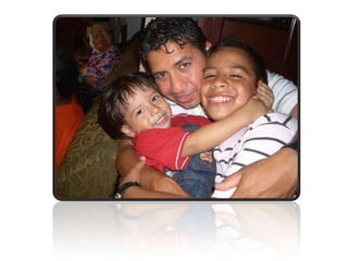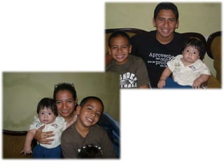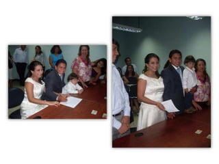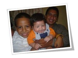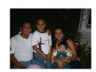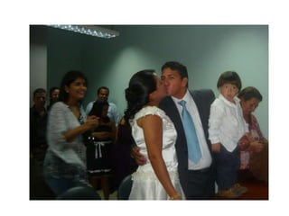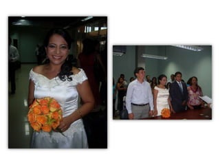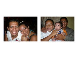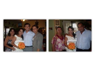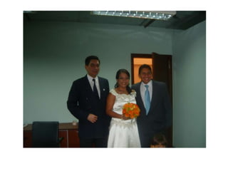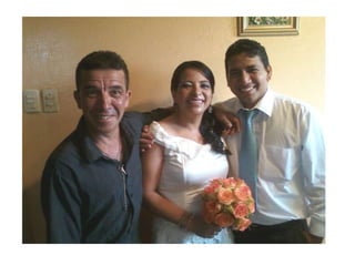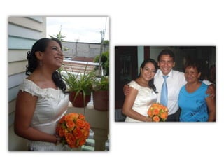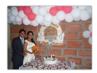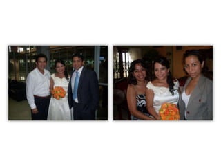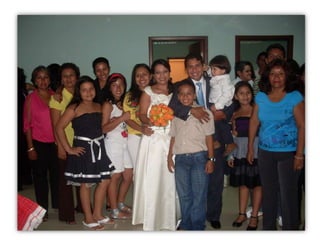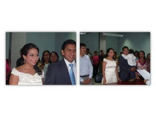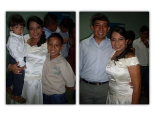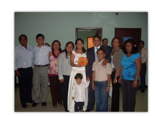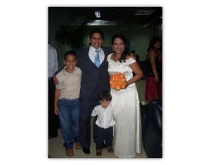 Este documento celebra el matrimonio de Israel Morales Santamaria y Candy Proaño Salvatiierra. Agradece a Dios y a sus familiares y amigos por acompañarlos en su unión y por ayudarlos a crecer juntos a través de los buenos y malos momentos. Incluye fotos que muestran momentos importantes de sus vidas desde la infancia hasta la actualidad como padres, incluyendo la primera comunión, el colegio, la universidad, sus hijos y tiempo compartido en familia y con amigos. Desea que Dios bendiga su