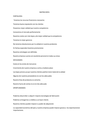El documento presenta un análisis DOFA de una empresa, identificando sus fortalezas como recursos financieros, buena reputación y calidad superior; debilidades como costos de envío, proveedores inadecuados y línea estrecha de productos; oportunidades como mejorar tecnología, créditos y mercados nuevos; y amenazas como competencia extranjera, sustitución de productos y cambios en regulaciones.