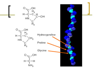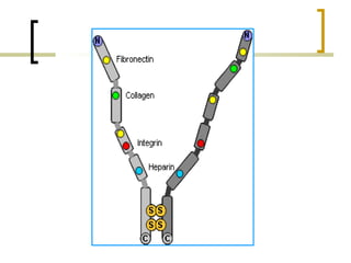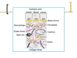Este documento describe los principales componentes de la matriz extracelular y la membrana basal. Resume los tipos de glicosaminoglicano, proteoglucanos como el agrecano, los diferentes tipos de colágeno como el colágeno tipo I, fibronectina, laminina, metaloproteinasas de la matriz y sus inhibidores TIMPs. También describe la estructura de la membrana basal incluyendo la lamina lucida, densa y reticular, así como sus principales componentes proteicos como el colágeno tipo IV, lamininas y proteoglucanos