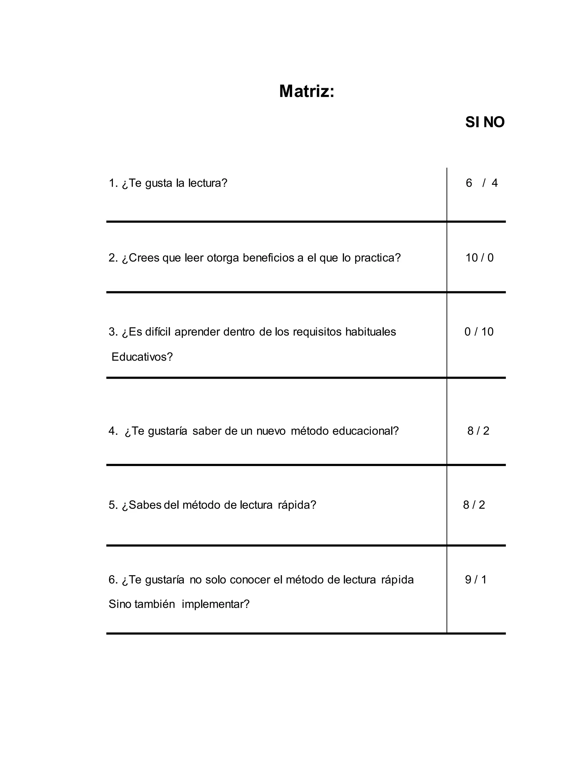 La encuesta mostró que la mayoría de las personas están a favor de la lectura rápida y creen que tiene beneficios. Creen que la lectura otorga beneficios, que la lectura rápida puede incentivar más la lectura y servir para concientizar sobre su importancia. También creen que la lectura rápida puede ayudar a estudiantes analfabetos y que permite memorizar y comprender rápidamente cualquier tipo de lectura.