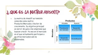 La matriz de Ansoff, creada por Igor Ansoff en 1957, es una herramienta que guía a las empresas en su búsqueda de crecimiento a través de cuatro estrategias: 1) penetración de mercado, 2) desarrollo de mercado, 3) desarrollo de productos, y 4) diversificación. Cada estrategia implica expandirse a nuevos mercados o productos de manera incremental o más arriesgada.