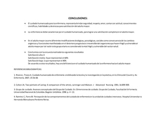1) El cuidado humanizado para la enfermera significa brindar seguridad, respeto y conocimientos para satisfacer al adulto mayor.