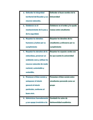 Este documento compara los deberes ciudadanos establecidos en el Artículo 83 de la Constitución de Ecuador con los deberes de los estudiantes universitarios. Presenta 17 deberes ciudadanos y sus equivalentes deberes para estudiantes, como respetar las leyes y autoridades, defender la integridad territorial, practicar la justicia y solidaridad, y participar en actividades cívicas y comunitarias.
