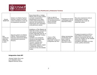 El documento compara cuatro planes de desarrollo turístico en Perú entre 1965 y 2001. La Misión Checchi (1965) buscó desarrollar el potencial turístico evaluando la oferta y atraer turistas. El Plan COPESCO (1969) promovió el desarrollo regional con recursos naturales y culturales. El estudio MONITOR (1990) propuso nuevas metodologías pero hubo poca cooperación. El plan maestro de JICA (2001) estableció planes regionales y transfirió tecnología de planificación turíst