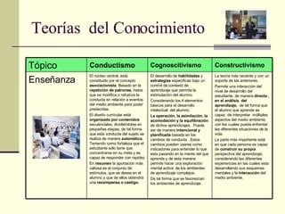 El documento presenta una matriz comparativa de teorías educativas como el constructivismo, cognitivismo y conductismo, enfatizando que el aprendizaje es un proceso activo donde el alumno construye sus propios conocimientos a través de la interacción con el medio ambiente. Se destaca la importancia de un currículo organizado que estimule al estudiante y promueva su autonomía intelectual, así como el rol del profesor como mediador en este proceso. La evaluación se aborda desde un enfoque cualitativo y cuantitativo, incluyendo diversas metodologías para medir el aprendizaje y las conductas adquiridas.