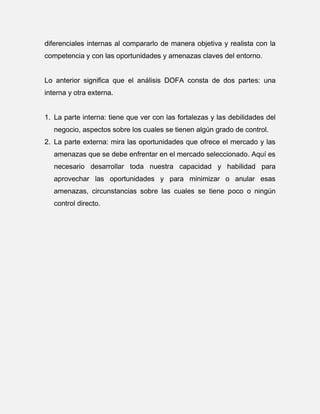 El análisis DOFA surgió de investigaciones en la década de 1960 para descubrir por qué fallaba la planificación corporativa. Consiste en examinar las Debilidades, Oportunidades, Fortalezas y Amenazas internas y externas de un negocio. Se utiliza para la planificación estratégica y el desarrollo de productos, y puede aplicarse a diferentes niveles y unidades de una organización.