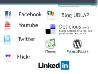 El documento presenta una matriz de comparación de redes sociales como Facebook, Youtube, Twitter y Flickr para portales como Novomania.org. Resume la información básica de las páginas de Facebook de la UDLAP, UPAEP y el Tec de Monterrey, incluyendo sus aplicaciones, número de seguidores y enlaces. También analiza brevemente las redes de otras organizaciones en Puebla.