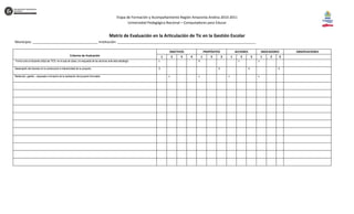 Este documento presenta una matriz de evaluación para medir la articulación de las TIC en la gestión escolar de una institución. La matriz incluye objetivos, propósitos, acciones e indicadores agrupados en criterios de evaluación. Asimismo, lista las áreas curriculares y recursos tecnológicos y pedagógicos disponibles, con espacios para observaciones sobre el proyecto del aula.