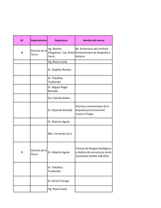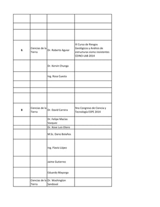 Este documento proporciona información sobre 12 eventos de investigación realizados por el Departamento de Ciencias de la Tierra de la Universidad de las Fuerzas Armadas ESPE. Incluye detalles como el nombre del evento, los expositores, el tema, si fue un evento nacional o internacional y la fecha. Los eventos cubren una variedad de temas relacionados con las ciencias de la Tierra como riesgos geológicos, tsunamis, fallas, suelos, medio ambiente y más.