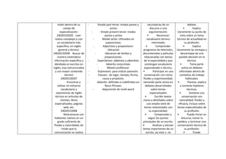 Este documento presenta los criterios de evaluación para medir la competencia en inglés de un individuo. Incluye objetivos como reproducir frases simples, comprender ideas principales y detalles en textos complejos, leer con fluidez y buscar información específica en documentos. También cubre habilidades de producción oral y escrita como mantener conversaciones, debatir sobre temas técnicos, y escribir textos claros sobre una variedad de asuntos. Los criterios evalúan la capacidad de comprender y usar estructuras gramaticales, tiempos verbales