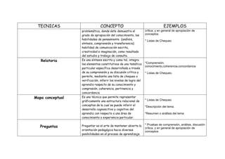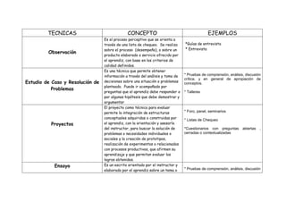 El documento describe diferentes técnicas para evaluar el aprendizaje, incluyendo la observación, estudios de caso, proyectos, ensayos, preguntas y aprendizaje autodirigido y colaborativo. Cada técnica involucra actividades como listas de verificación, entrevistas, foros o el uso de herramientas como Blackboard para evaluar la comprensión, conocimiento y habilidades del aprendiz. El documento también explica técnicas como el aprendizaje dual y la ficha técnica para describir productos.