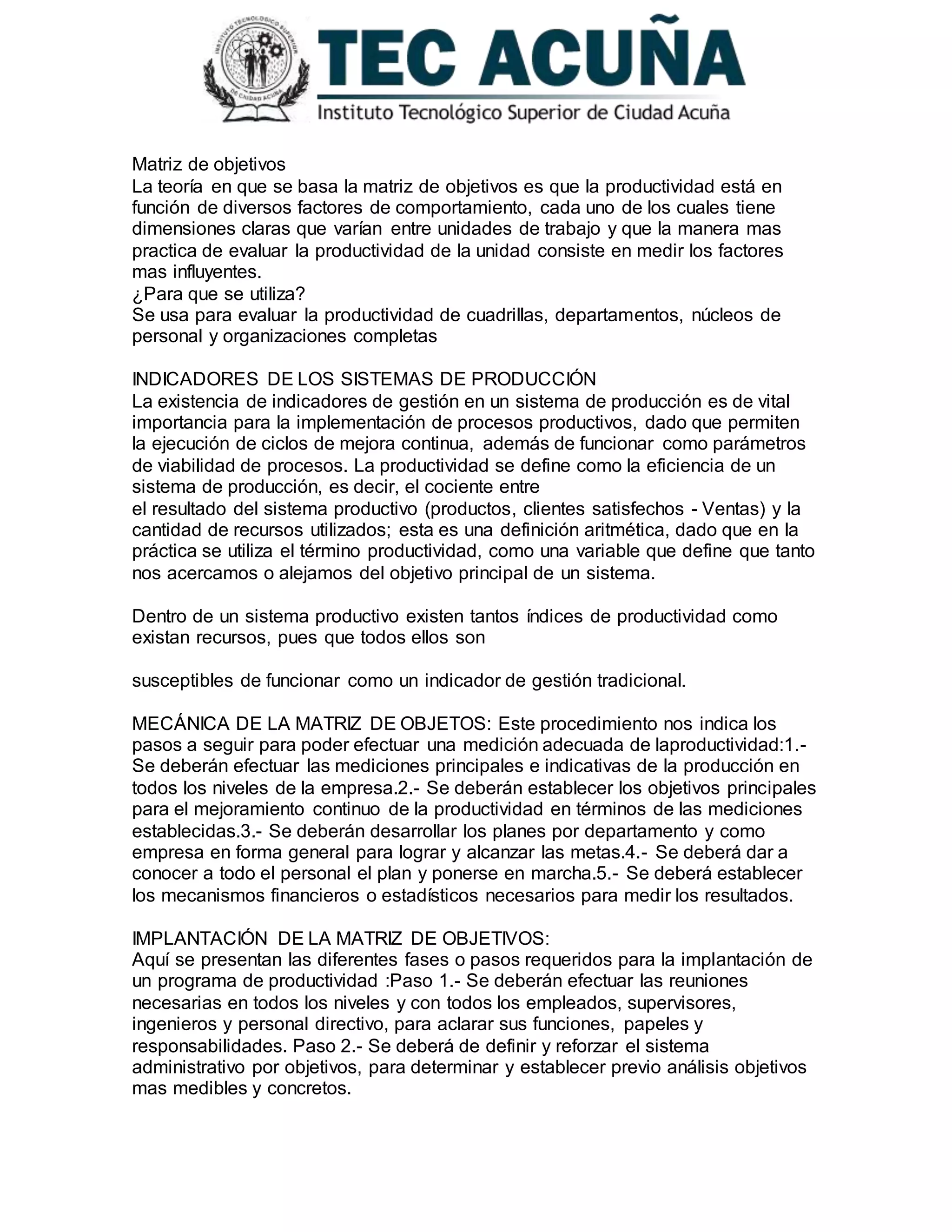 La matriz de objetivos evalúa la productividad midiendo los factores más influyentes como el comportamiento y la productividad de cuadrillas, departamentos, personal y organizaciones completas. Se define la productividad como la eficiencia de un sistema productivo que mide los resultados en relación a los recursos utilizados, y existen tantos índices de productividad como recursos existan. La matriz de objetivos implica medir la producción en todos los niveles, establecer objetivos de mejora continua, desarrollar planes departamentales y comunicar el plan a todo el personal.