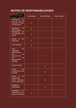 La matriz de responsabilidades asigna tareas específicas para el proceso de selección de personal a Iván González, Jeison Cárdenas y Paula Jiménez, incluyendo la verificación de hojas de vida, preparación y aplicación de pruebas, establecimiento de cronogramas, entrevistas y archivo de documentación. Iván González tendrá la mayoría de responsabilidades centradas en la logística y aplicación práctica del proceso, mientras que Jeison Cárdenas y Paula Jiménez apoyarán con algunas tareas específicas