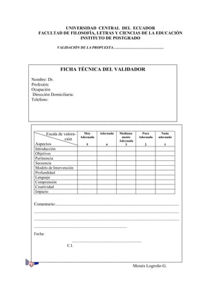 Este documento presenta matrices y criterios para validar una propuesta. Incluye una ficha técnica para el validador con su información de contacto y una escala de valoración de aspectos como introducción, objetivos, pertinencia, entre otros. También presenta instrucciones para la validación indicando que el validador debe leer detenidamente la propuesta, emitir su criterio sobre aspectos como funcionalidad y aplicabilidad, y marcar su nivel de acuerdo o desacuerdo en las matrices provistas.