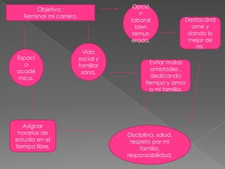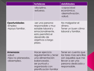 El documento presenta un análisis FODA que identifica las fortalezas como la disciplina y el esfuerzo, las debilidades como la capacidad económica y la desmotivación, las oportunidades como el empleo y el apoyo familiar, y las amenazas como la salud y el desempleo. El objetivo principal es terminar la carrera a través de la disciplina, el cuidado de la salud, el respeto a la familia y la responsabilidad.
