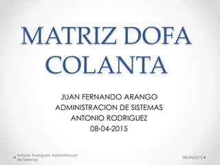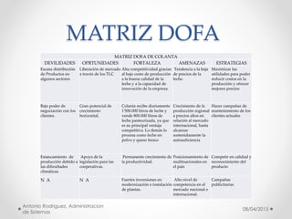 La matriz DOFA de Colanta identifica sus debilidades, oportunidades, fortalezas y amenazas. Entre las debilidades están la escasa distribución de productos y el bajo poder de negociación con clientes. Las oportunidades incluyen la liberación de mercados a través de tratados de libre comercio y el potencial de crecimiento. Las fortalezas son su alta competitividad debido a bajos costos, buena calidad de leche y capacidad de innovación, así como recibir 1.5 millones de litros de leche diarios.